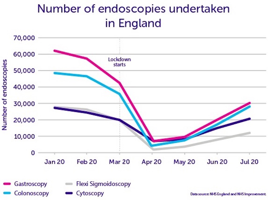 In September 2020, Cancer Research UK reported that, in the 6 months since lockdown, cancer screening was cancelled for 3.2 million people, and that between March and July there was a 39 per cent drop in the seven key diagnostic tests for cancer in England. It also estimated that, between April and August, around 350,000 fewer people than normal in the UK were referred with suspected cancer symptoms.