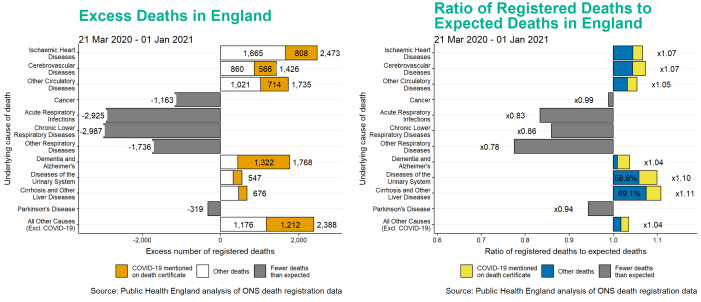On 14 January, Public Health England published its analysis of ONS figures on deaths over a shorter timeframe, between 21 March, 2020 and 1 January, 2021, the period under which England has been under various degrees of lockdown restrictions. These show that, even with the WHO’s instructions to medical practitioners that COVID-19 must always be listed as the ‘underlying cause’ of death, a total of 7,511 excess deaths in which other health conditions were listed as such were recorded as ‘COVID-19 deaths’.