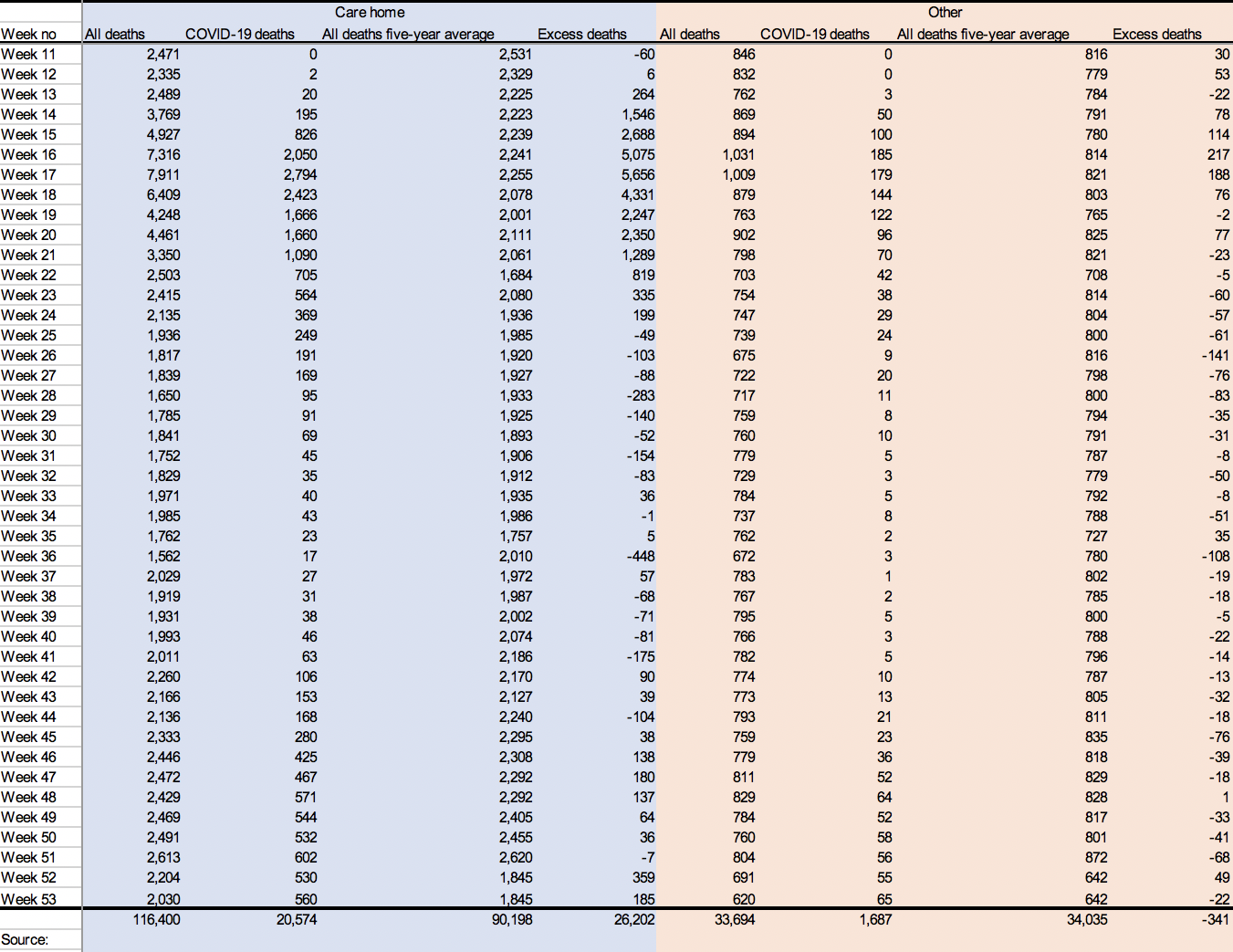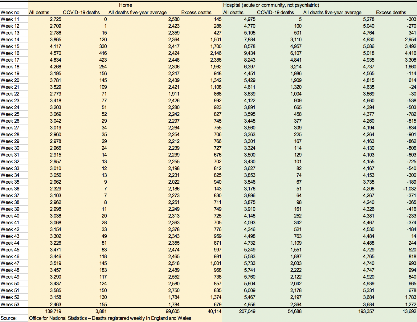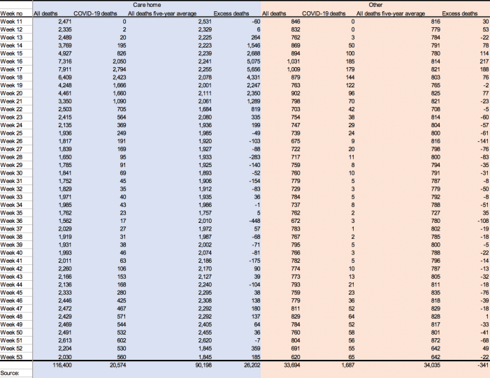 But — comes the response from the COVID-faithful — if these reports and predictions are accurate, wouldn’t the huge increase in deaths show up at the end of the year on the records of overall mortality? Well, yes and no. Let’s take a look. In January 2021, the Office for National Statistics published ‘Deaths registered by place of occurrence’, in which it records, in the accompanying dataset, the following deaths between 7 March, 2020 (week 11 of the year) and 1 January, 2021 (week 53).