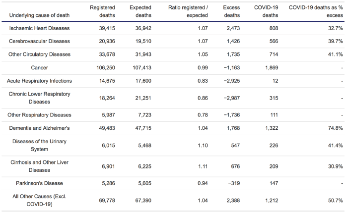 As can be seen, deaths from heart diseases, cerebrovascular diseases, other circulatory diseases, dementia and Alzheimer’s disease, urinary diseases, liver diseases, and from causes other than COVID-19, numbered 11,013 over the 5-year average; yet 5,057 of these were listed as ‘COVID-deaths’. Even when deaths from the underlying cause were below the 5-year average, as they were for cancer, acute respiratory infections, chronic lower respiratory diseases, other respiratory diseases and Parkinson’s disease, 2,454 deaths were still registered as ‘COVID-19 deaths’.