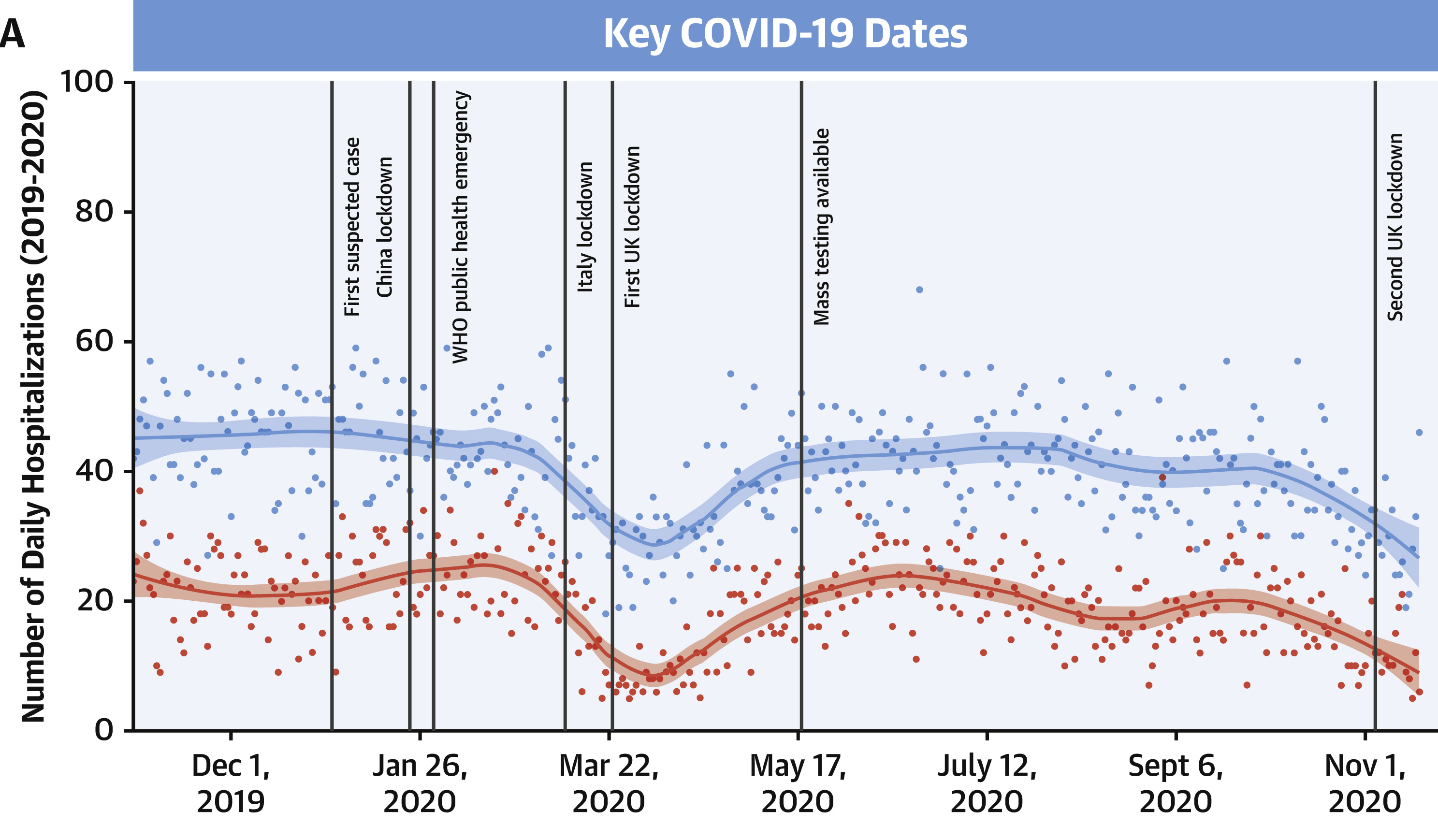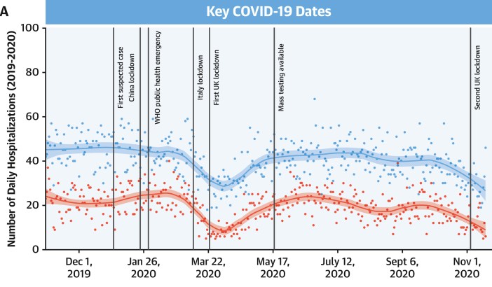 In January 2021, the Journal of the American College of Cardiology, in a study of 66 UK hospitals, reported that, during the first lockdown, daily admissions for myocardial infarction or heart attack (the blue line in the table below) and heart failure (red line) decreased by 54 per cent. Admissions recovered to 95 percent of pre-lockdown levels by June; then fell again between October and November to 41 per cent for heart failure and 34 per cent for heart attacks. In both instances, there was a clear correlation between lockdown and reduction in medical care.