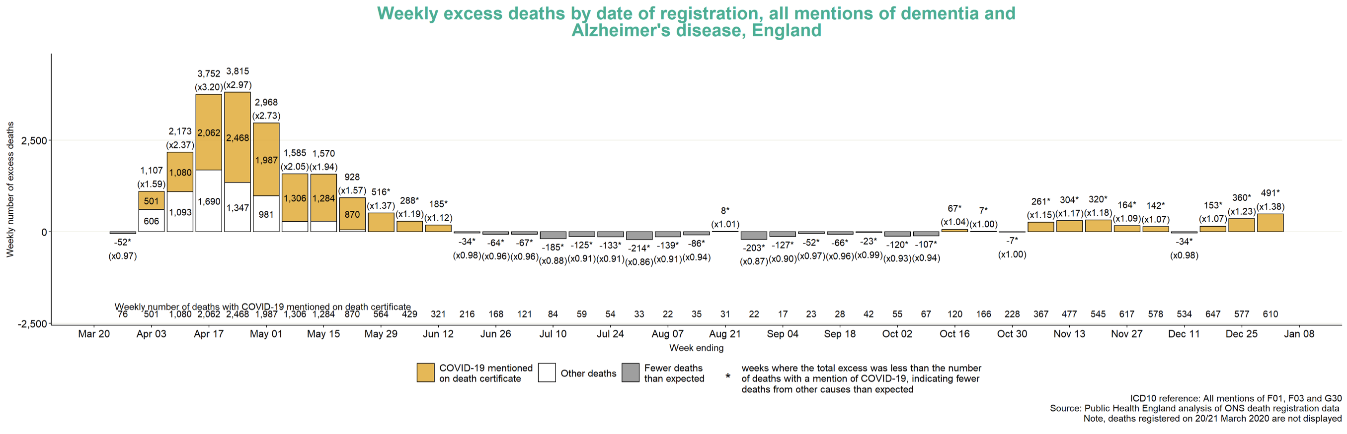 In May 2020, the Office for National Statistics reported that, in the previous month, deaths from dementia and Alzheimer’s disease had increased above the average by 9,429 in England and 462 in Wales. This was 83 per cent higher than usual in England and 54 per cent higher in Wales, with charities reporting that a reduction in essential medical care and family visits was responsible.