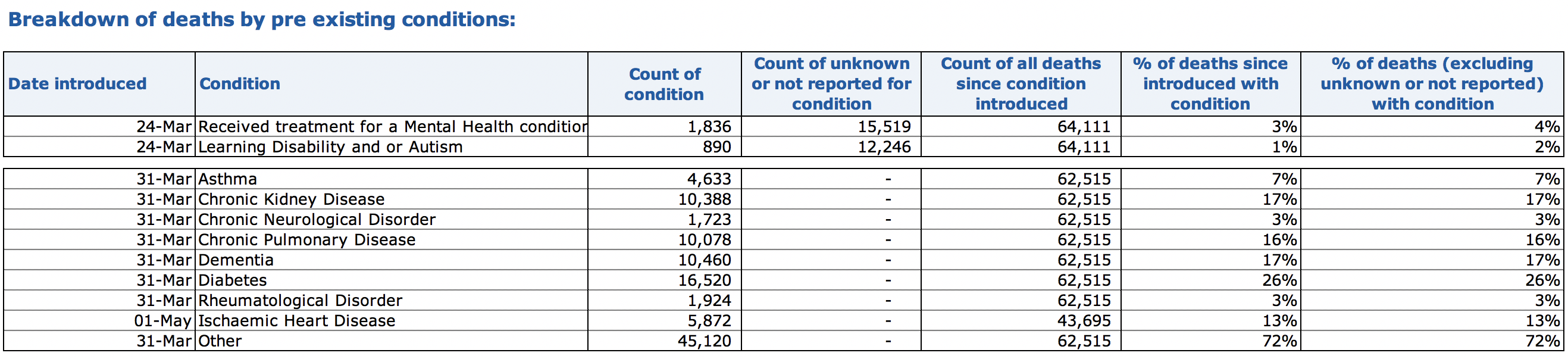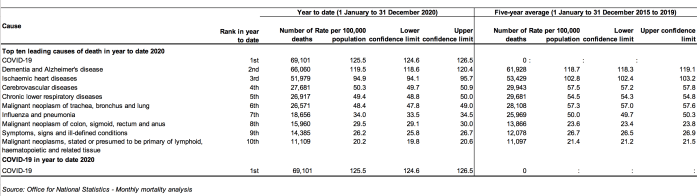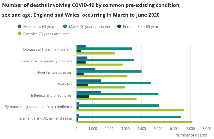 Following these definitions, the ONS reported that, of the 50,335 deaths attributed to COVID-19 in England and Wales between March and June 2020, 45,859, 91.1 per cent, had at least one pre-existing health condition, with a mean average of 2.1 conditions for those aged 0 to 69 years of age and 2.3 for those aged 70 years and over. The accompanying dataset recorded that, in the 4 months between March and June 2020, the most common ‘main’ pre-existing health condition recorded on death certificates in England and Wales was dementia and Alzheimer’s disease, with 12,869 deaths constituting 25.6 per cent of all deaths attributed to COVID-19.