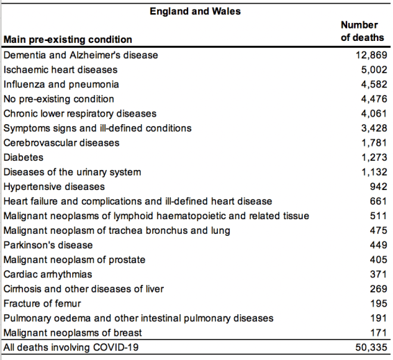 But that’s not all. When recording all pre-existing health conditions, their presence on the death certificates of ‘COVID-19 deaths’ is even higher, with 13,840 deaths attributed to COVID-19 having dementia and Alzheimer’s disease also listed, 11,029 deaths having influenza and pneumonia, and 9,820 having diabetes.