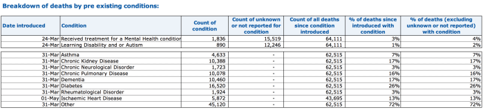 Unfortunately — and extraordinarily, given that we’re supposed to be in the middle of an ‘unprecedented’ epidemic threatening the safety of the UK public — since July no other data on the pre-existing health conditions, main and common, of people whose deaths have been officially attributed to COVID-19 has been published by the Office for National Statistics. I’ve written to the ONS to ask when they will update their records, and they responded that they are hoping to do so in February 2021. Why they stopped doing so in July I will leave to you to judge; but when these figures are published I shall add them to this article.