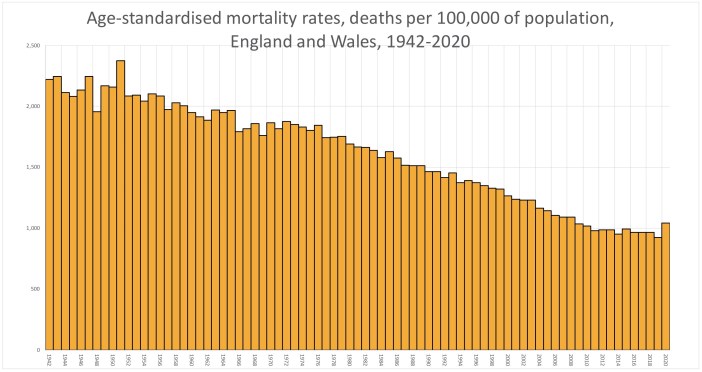 Fortunately, following a freedom of information request, on 12 January the Office for National Statistics published a report on ‘Annual number of deaths, crude and age-standardised mortality rates, deaths registered in England and Wales, 1838 to 2019 (final) and 2020 (provisional)’. This shows that the age-standardised mortality rate in 2020 of 1,043.5 deaths per 100,000 of the population was surpassed not only in 2008 (with 1,091.9 deaths per 100,000), but also in 2007 (1,091.8), in 2006 (1,104.3), in 2005 (1,043.8), 2004 (1,163.0), 2003 (1,232.1), 2002 (1,231.3), 2001 (1,236.2) and 2000 (1,266.4). Unfortunately, the calculation of age-standardised mortality rates for England and Wales only goes back to 1942; but every year between then and 2008 had a higher mortality rate than 2020. Even by the measure of the ‘crude mortality rate’ not adjusted for an ageing population, no year before 2004 had a lower mortality rate than 2020. In fact, over the last 79 years, 2020 has the 12th lowest mortality rate.