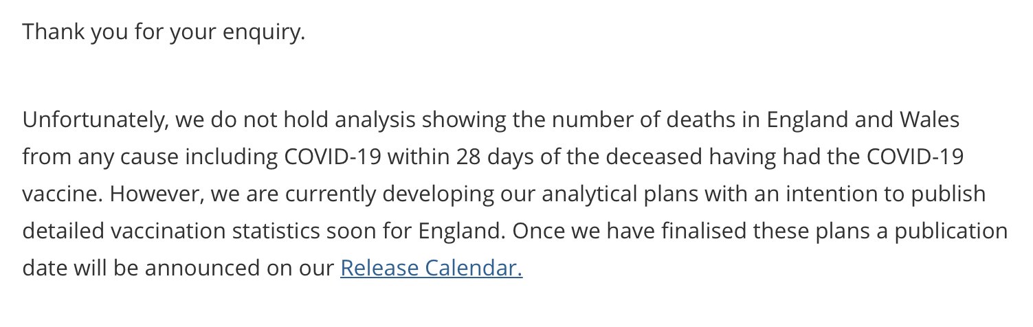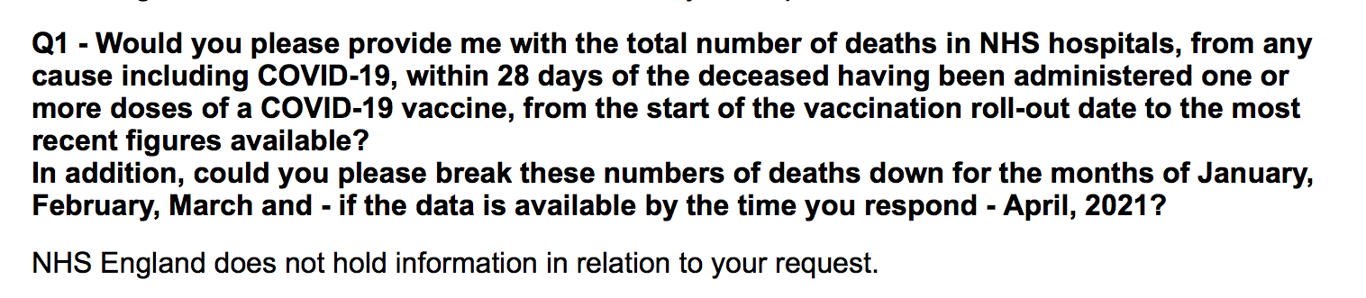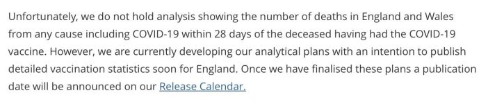 One might question why the ONS, in its reply to my FOI request, didn’t tell me that, although it doesn’t hold records of deaths within 28 days of injection with a COVID-19 ‘vaccine’, it does hold records of deaths within 21 days. But then, this is the sort of deliberate obstruction and half-lies with which all these organisations have concealed the consequences of the UK ‘vaccination’ programme from the British public.