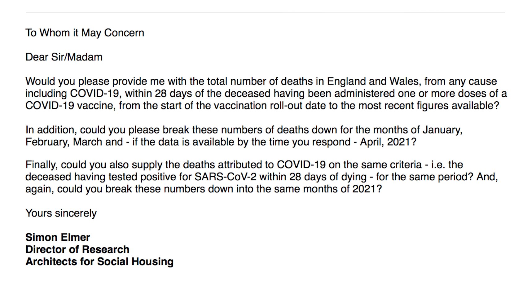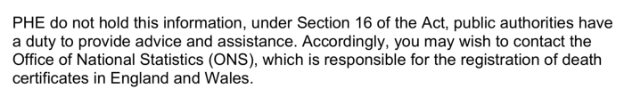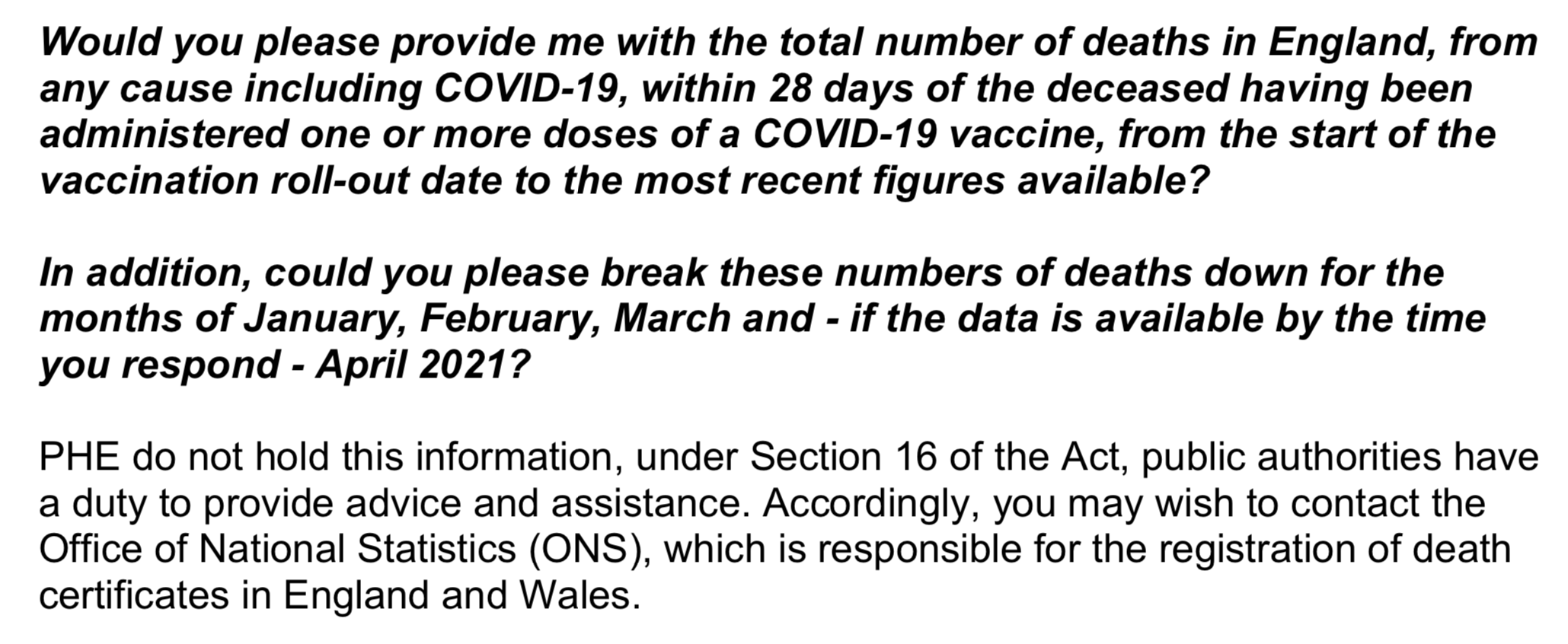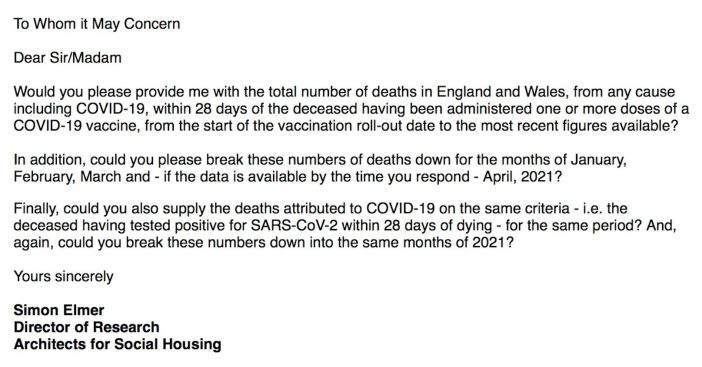 We’ve already seen that these ‘vaccines’ neither prevent infection with SARS-CoV-2 nor lessen the severity of the symptoms of COVID-19; so to try and establish a more accurate comparison between the criteria by which a death is attributed to Coronavirus disease 2019 and a COVID-19 ‘vaccine’, on 12 April I sent a Freedom of Information request (below) to Public Health England, the National Health Service and the Office for National Statistics.