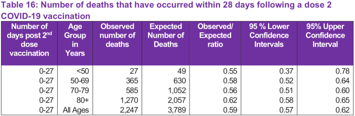 The Directorate also recommended an analysis of the overall deaths also published by PHS on 23 June, in which it compares ‘the observed number of deaths to the expected number of deaths’, which appears on page 28-29 of the report, Public Health Scotland, COVID-19 Statistical Report: As at 21 June, 2021. PHS clarifies that their analysis ‘includes all recorded deaths due to any cause and does not refer to deaths caused by the vaccine itself.’ Since the ‘vaccination’ programme is being pushed on the entire adult population, they write: