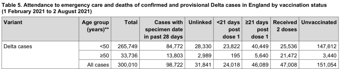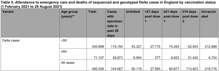In this table of ‘Attendance to emergency care and deaths…Delta variant…by vaccination status 1 February-29 August’ there are 4 categories of people: those up to 21 days post first dose, those beyond 21 days post first dose, those beyond 14 days of a second dose, and unvaccinated. The only explanation I can think of for omitting those within 14 days of a second dose is that you are not officially considered to be vaccinated at all until 14 days have elapsed and the attendances at emergency care/deaths of those people are, presumably, included in the ‘unvaccinated’ column. The corollary would be that the figures for those demarcated by the 21-day cut-off for the first dose only represent those people attending/dying from 14 to 21 days after vaccination and, again, the 0-14 day cohort is subsumed in the ‘unvaccinated’ column.
