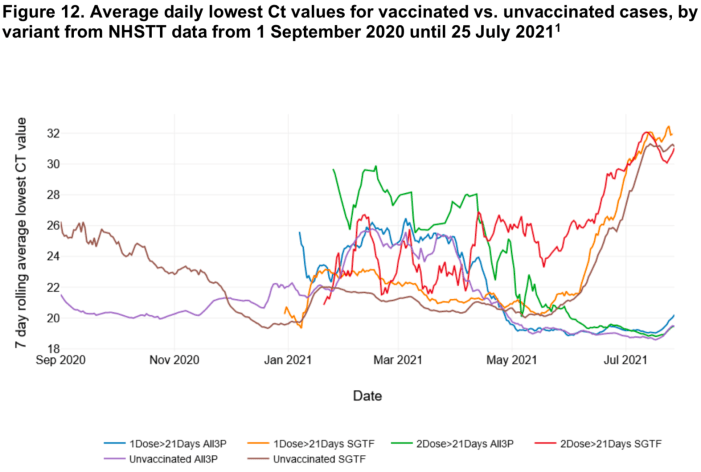 Below this statement, a chart (below) shows Ct values between September 2020 and July 2021 in people who have been diagnosed with the Alpha variant (shown in red, yellow and brown) and the Delta variant (shown in green, blue and purple). The three colours for each variant show Ct values for those who are ‘unvaccinated’ (respectively, brown and purple), those with 1 dose of ‘vaccine’ injected more than 21 days ago (yellow and blue), and those with 2 doses of ‘vaccine’ more than 21 days ago (red and green).