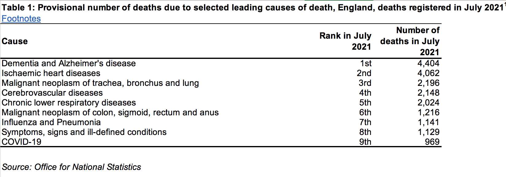 Until the ONS publishes the figures at the end of the year, I can’t repeat my previous analysis of these deaths by other causes; but as a cross section of where COVID-19 comes in the different causes of death — even according to the deliberately exaggerated number of deaths attributed to the disease — according to a series of FOI requests (now the only way, it seems, to extract truth out of the institutions repeatedly and consistently lying to the British people), in July 2021, the 969 deaths attributed to COVID-19 constituted the 9th leading cause of death in England, with dementia and Alzheimer’s disease first with 4,404 deaths, followed by ischaemic heart diseases in second with 4,062, and malignant neoplasms (cancers) of the trachea, bronchus and lung in third with 2,196, as follows: