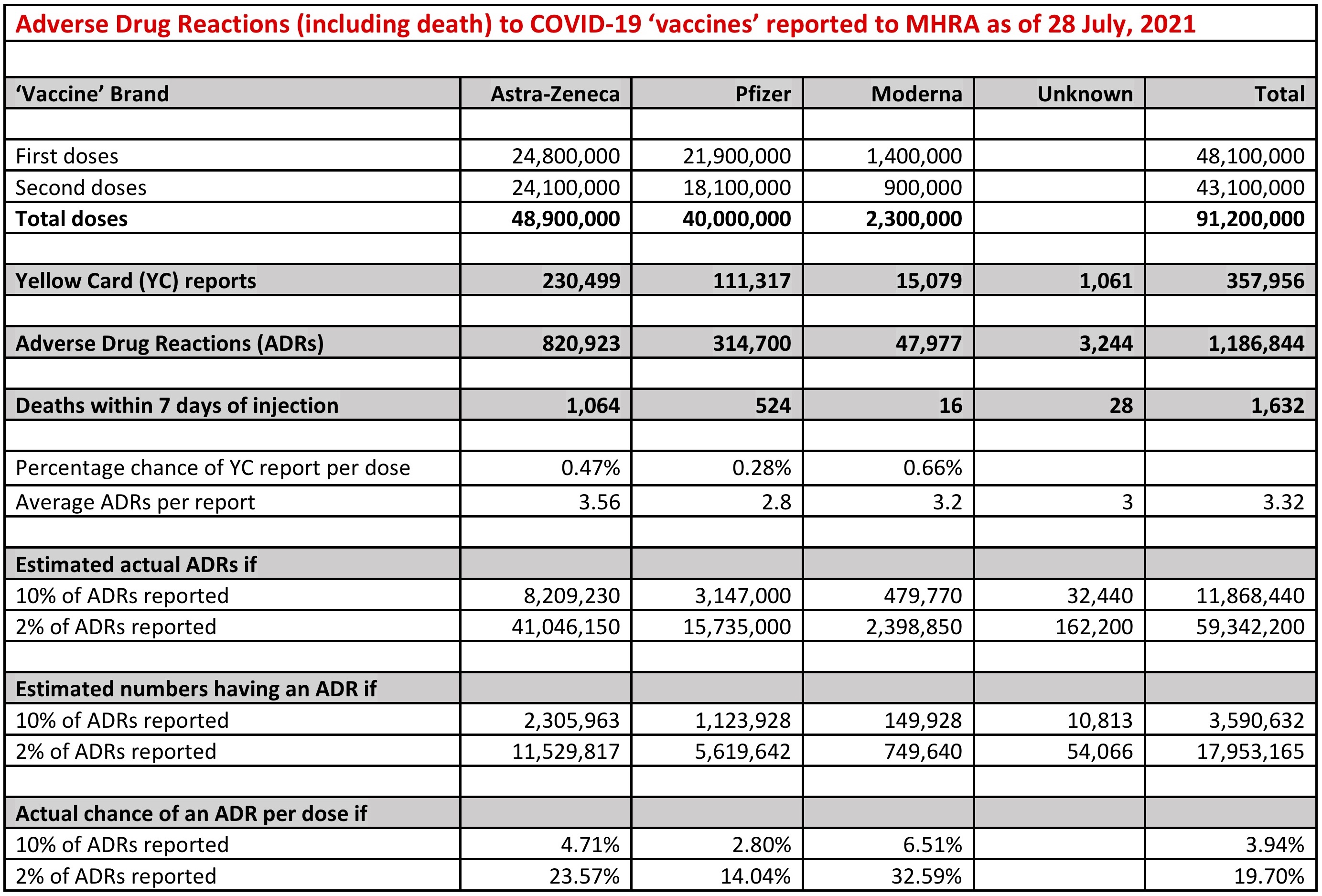 A summary of these Yellow Card reports is updated and published by the MHRA every Friday, and generally, in order to collate the figures, there’s about a week’ lag behind the received reports. I’m reporting here the most recent figures available at the time I finish writing this article. As of 1 September, 91.2 million doses of experimental, temporarily-authorised COVID-19 ‘vaccines’ have been injected into the UK public over a roughly 9-month period. This has resulted in 357,956 yellow-card reports to the MHRA of 1,186,844 adverse drug reactions (ADRs), including 1,632 deaths within 7 days of being injected. The number of reactions and deaths are not the same across the four brands of authorised ‘vaccines’, but vary considerably according to the pharmaceutical company producing and distributing the drug, which in the UK so far are limited to AstraZeneca, Pfizer and Moderna.