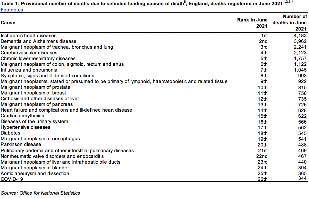 In June 2021, the 344 deaths attributed to COVID-19 constituted the 26th leading cause of death in England, far behind, once again, 4,183 deaths from heart diseases, 3,962 deaths from dementia and Alzheimer’s disease, and 2,241 deaths from neoplasms.