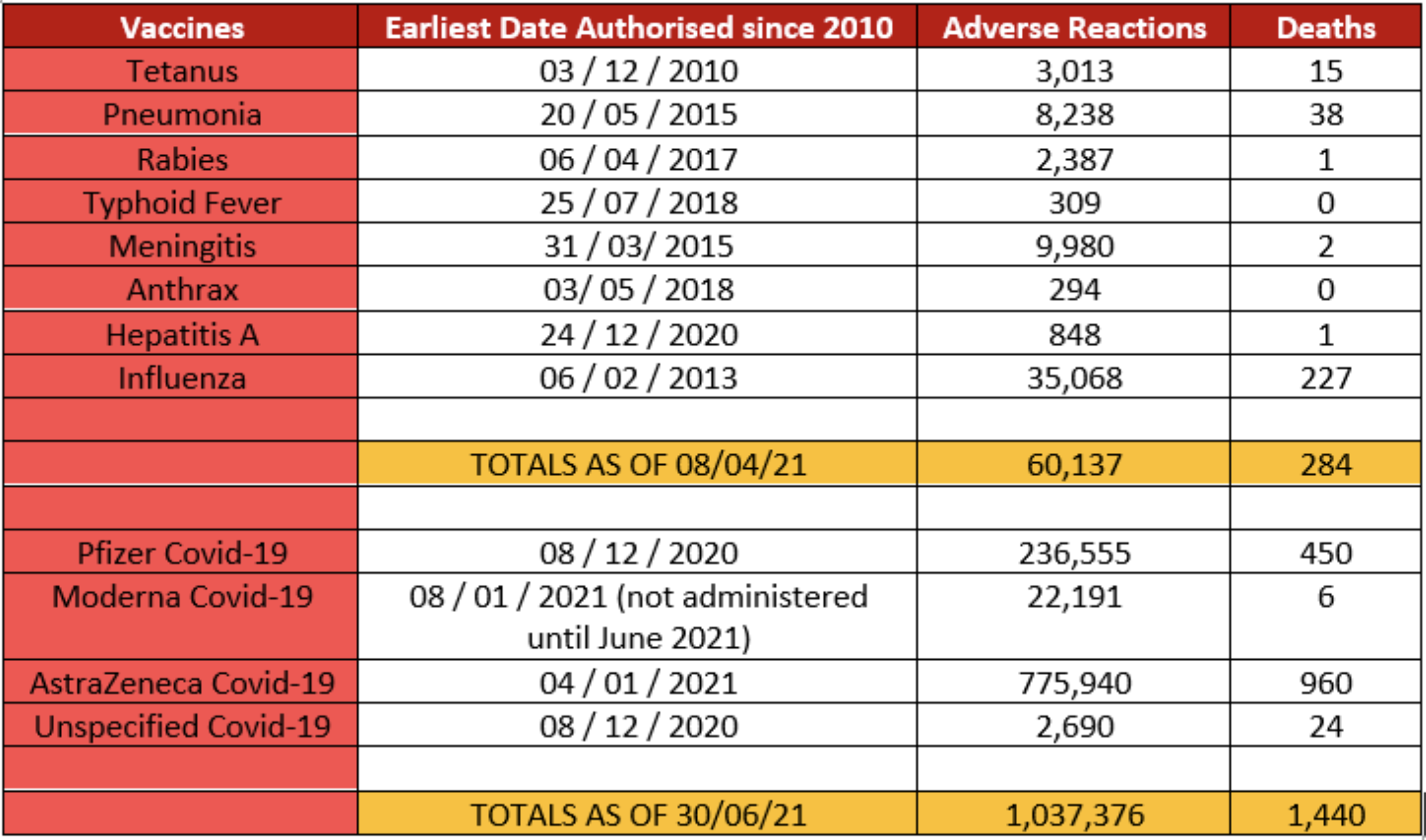 On 29 June, the MHRA responded with the information — although not broken down into each month — showing the total number of adverse drug reactions and deaths to the following vaccines: