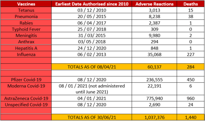 What the MHRA’s figures showed is that, in total, as of April, 2021, these eight types of vaccines have resulted in 60,137 adverse drug reactions and 284 deaths. In comparison, as of 30 June, 2021, the most recent date for which figures were available before the article was published, there were 1,037,376 adverse drug reactions to COVID-19 ‘vaccines’ reported to the MHRA, including 1,440 deaths. This was, already, 17.25 times the 60,137 adverse drug reactions reported to the MHRA for all other vaccines approved in the UK since 2010.