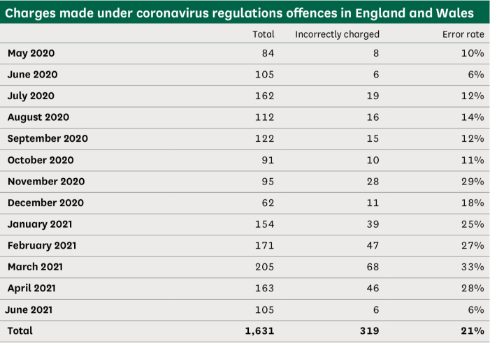 In every respect, then, the guidance and regulations of the UK biosecurity state has authorised and exaggerated the racism, violence and unaccountability UK police forces. Indeed, the campaign of terror authorised by the executive of this constitutional dictatorship has been such that the police have gone far beyond the limits of these vastly increased and expanded laws in enforcing compliance on a terrorised and bullied population. Of the 1,631 people in England and Wales charged with a coronavirus regulation offence between 1 May 2020, and 30 June 2021, 319 were incorrectly charged, an error rate of 21 per cent (below). But then, as Robespierre argued, virtue without terror is powerless, and no abuse of power will not be excused in educating the public in its new civic duties of obedience, compliance and collaboration with the UK biosecurity state.