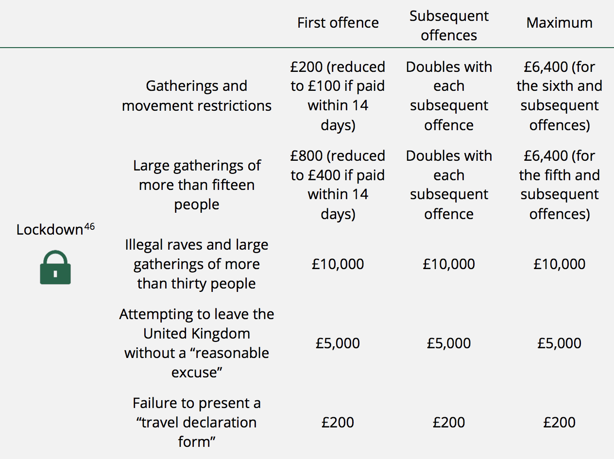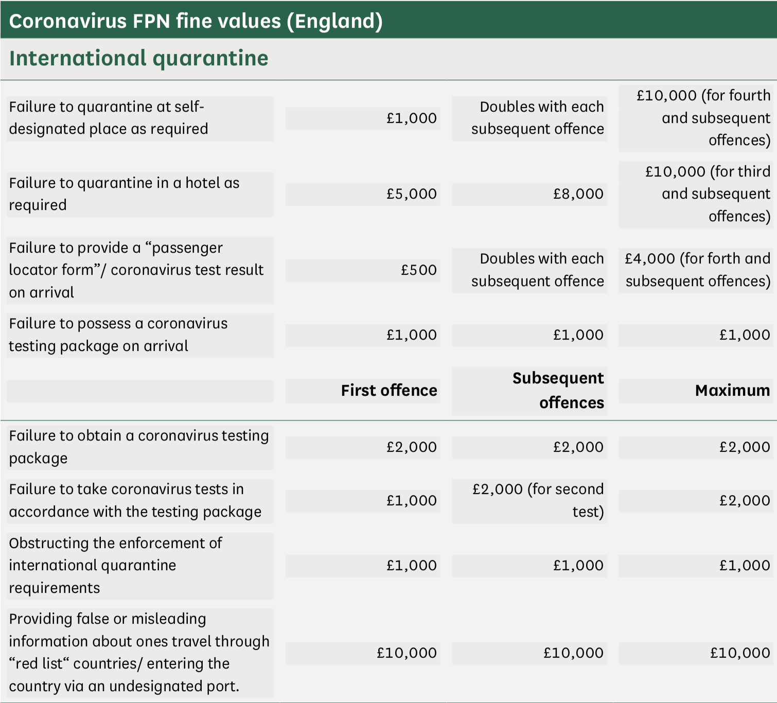3) Since they remain in effect under the Government’s COVID-19 Response: Autumn and Winter Plan, the Fixed Penalty Notices for not complying with international travel quarantine under The Health Protection (Coronavirus, International Travel) (England) Regulations 2020 remain in place, and have, indeed, been extended by The Health Protection (Coronavirus, International Travel and Operator Liability) (England) Regulations 2021, and are printed as follows in the updated briefing: