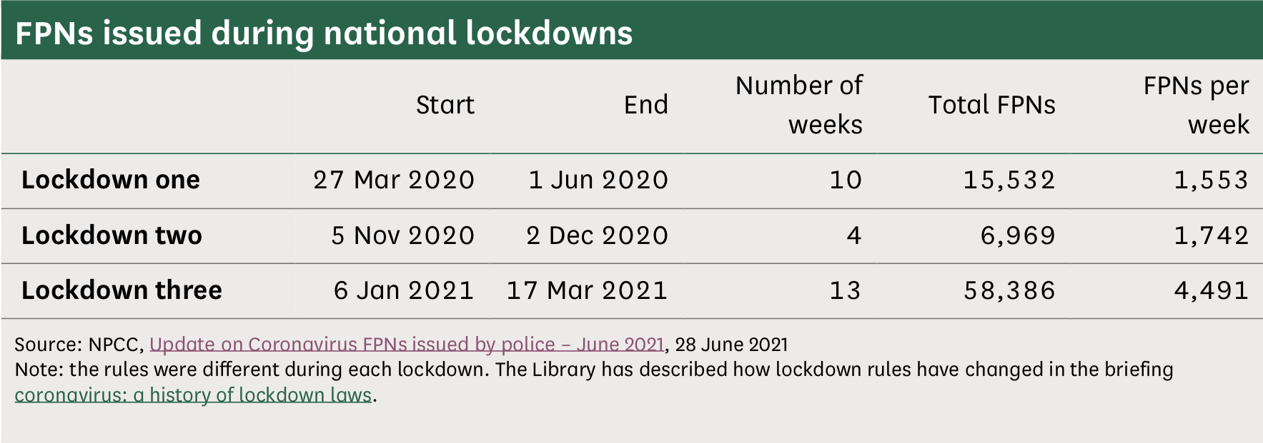 The National Police Chiefs’ Council has reported that, in the 15 months between 27 March 2020 and 20 June 2021, they issued 366 Fixed Penalty Notices for large gatherings incurring a £10,000 fine. These included, but were not limited to, unlicensed music events, private parties and protests. As of 22 September, 2020, a year ago, 9,428 FPNs had been paid and 9,413 had not been paid. Those who do not pay may face criminal proceedings. In addition, 3,440 FPNs in England and 501 in Wales have been issued for a gathering of more than 15 people, incurring a fine of £800. In addition, those who provide false or misleading information to avoid hotel quarantine can be investigated for fraud, and those found guilty of the relevant fraud offence can be imprisoned for up to 10 years if convicted at a Crown Court. If convicted by a Magistrate, the sentence is a maximum of 12 months.