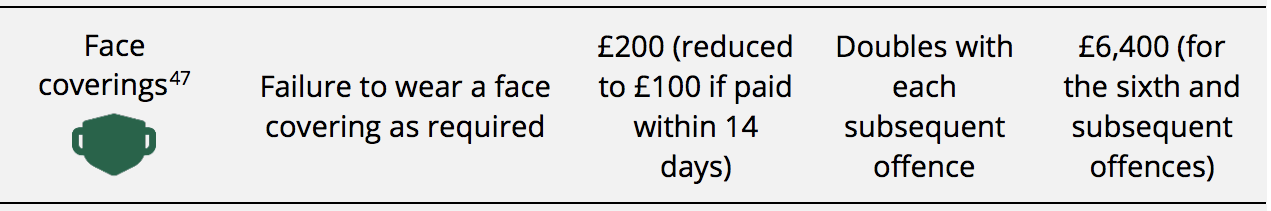 2) For not complying with face coverings where mandated under The Health Protection (Coronavirus, Wearing of Face Coverings in a Relevant Place) (England) Regulations 2020, and The Health Protection (Coronavirus, Wearing of Face Coverings on Public Transport) (England) Regulations 2020, both of which were also revoked on 18 July, the Fixed Penalty Notices were as follows: