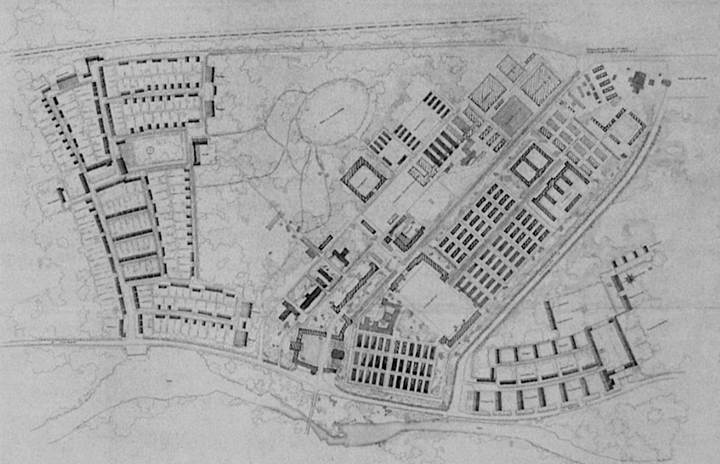 Plan for the expansion of Auschwitz camp I, with housing estates for the SS on either side, 1942.
