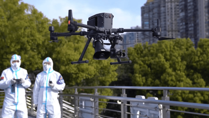 Police deploy drones to patrol Shanghai’s 26 million residents under lockdown, April 2022.