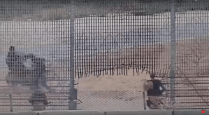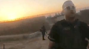 In contrast, at 0:44 this still (above left) from the previous footage, shows what the so-called ‘elite’ Hamas militants were wearing: flak jackets over short-sleeved white shirts, combat trousers and trainers, with distinctive, bright-green Hamas scarves wrapped around their heads. Interestingly, we can see in another still of the White man at 0:54 (below left) that he does have one of the Hamas headscarves, but it’s wrapped around his left wrist. It looks like he’s taken it off someone. Perhaps it was from the man lying injured but still moving on the Gaza side of the barrier (0:32 below right), who appears by his clothes — flak jacket over a white shirt — to be a member of Hamas. But then, who killed this man, if the Israel Defence Forces were not present? And if they were, where are they now? Perhaps the Hamas scarf the White man has picked up is a memento for the folks back in Texas. Or perhaps it’s to identify himself to the Hamas militants. Either way, I can’t see this man living in the Gaza Strip. Can you?