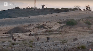 Here are stills from more footage. At 1:43, in the foreground of the first still (above left), motorcyclists cross into the 300-yard ‘no-man’s land’ on the Gaza side of the barrier. The border fence bottom left of the image is open. Beyond it is the second fence, which is equipped with motion sensors. On the hill beyond is a watchtower armed with antennae, radar, cameras and remote-control machine guns. In the footage, none appear to be operating. At 1:45, in the next still (above right), the motorcyclists pass through a hole cut in what looks like the second fence. Either side of the gap stand men who, in contrast to the motorcyclists, appear to be dressed in military uniforms and flak jackets similar to those worn by the Israel Defense Forces (below right).