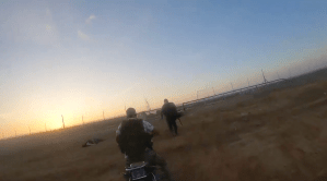 Let’s break this footage, which is taken from the head camera of the Hamas motorcyclist, down into stills. At 0:41, a white man waves at the Hamas militant struggling to get his bike over the ramp (top left). At 0:53, the white man gestures to the motorcyclist and shouts something — perhaps ‘Here’ (top right). At 0:54, the white man passes by the motorcyclist (bottom left). And at 0:59, the white man continues to help other motorcyclists passing through the fence (bottom right).