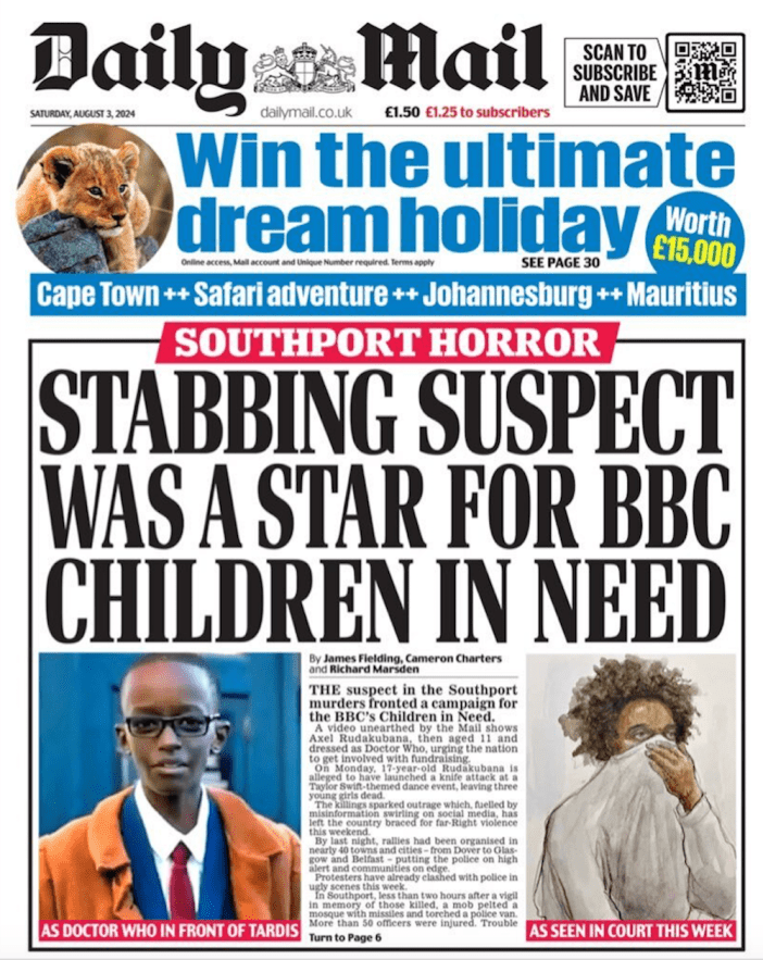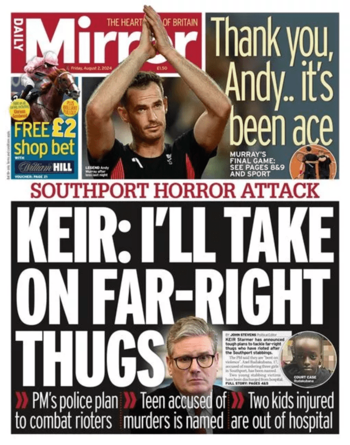 In support of which, rather than holding this government to account for its politicisation of our police forces, law courts and prison service, the UK media — Left and Right, tabloid and broadsheet — have also demonstrated that, if you’re a foreigner in the UK, you can do anything, including murder and gang-rape English children, and it will defend you, even to the extent — as it did for the Southport murderer — of representing you as the victim; while if you’re English and you dare to protest, you will be branded ‘far-right’, ‘thugs’, ‘rioters’ — an offence that carries a sentence of up to 10 years in prison — ‘bigots’, ‘racists’ and — most predictively of all — a ‘tiny minority’.