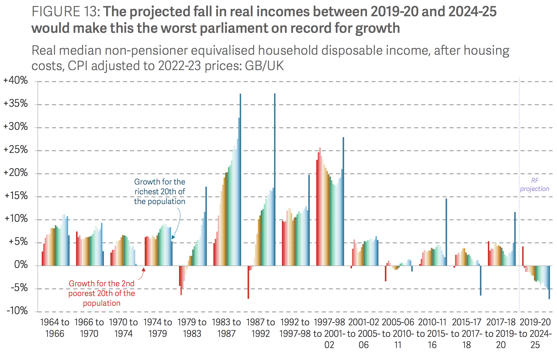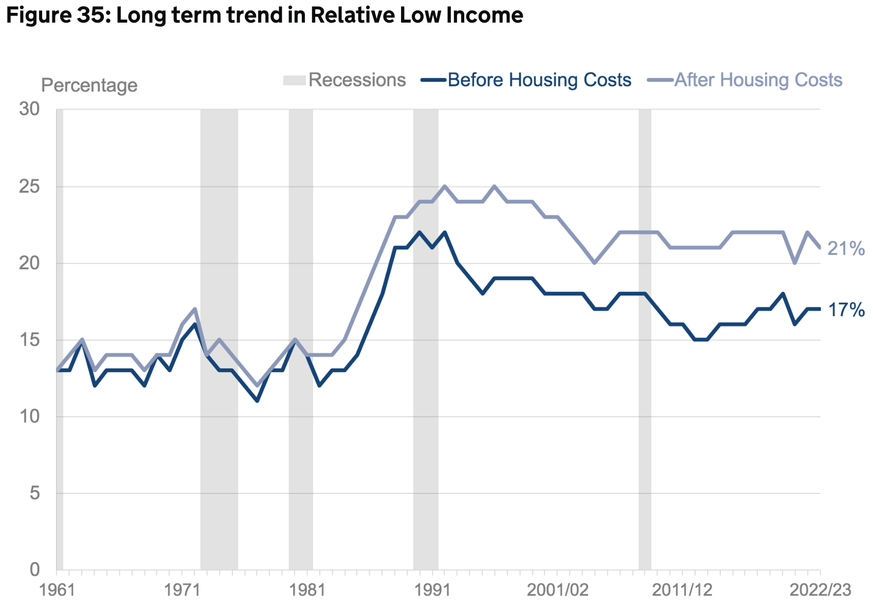 It’s difficult to measure the conditions of the working class in Britain when the term itself has been all but eradicated by an ideology that, under the Equality Act 2010, measures disadvantage by race, gender and sexuality and other protected characteristiscs of identity politics, but not by class. This September, however, the Social Mobility Commission reported that the percentage of children living in relative poverty after housing costs in the UK has increased from 27.1 percent in 2013 to 29.5 percent in 2023. In England it’s 30.2 percent of children, up from 27.5 percent in 2013. These may seem like small percentage increases, but they represent millions of children. In 2023, median household income for the poorest fifth of the population was £16,400, 2.4 percent below what it was before lockdown. The mean (average) household disposable income for the richest fifth of households (£82,900) was six times larger than the poorest fifth of households (£15,000); yet the mean weekly household expenditure was only twice as much, indicating the burden of housing costs on the British working class.