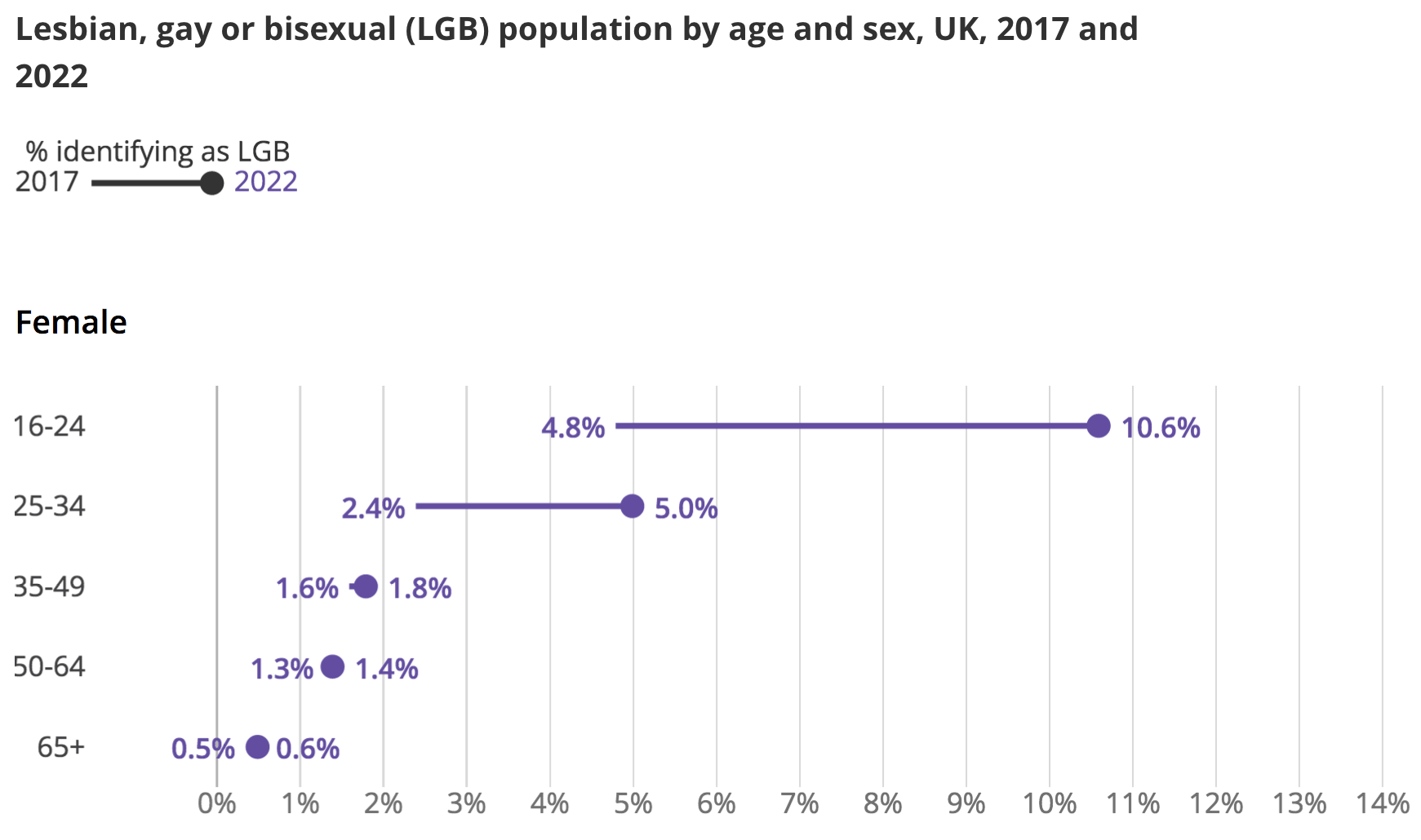 A decade ago, across the UK, 1.5 percent of the population identified as lesbian, gay or bisexual in 2012. This rose in just five years to 2.1 percent in 2017, when double that, 4 percent of people aged 16-24, identified as LGB. By 2022, this had risen again to 3.3 percent of the population (3.8 percent of men, 3 percent of women), more than double what it was a decade before. Remarkably, 9.2 percent of people aged 16-24 identified as lesbian, gay or bisexual. And for women of that age, as distinct from across the age spectrum, this rose to 10.6 percent, doubled what it was in 2017 (4.8 percent), compared to 7.9 percent of men. In contrast, for those aged over 65, only 0.7 percent identified as lesbian, gay or bisexual.
