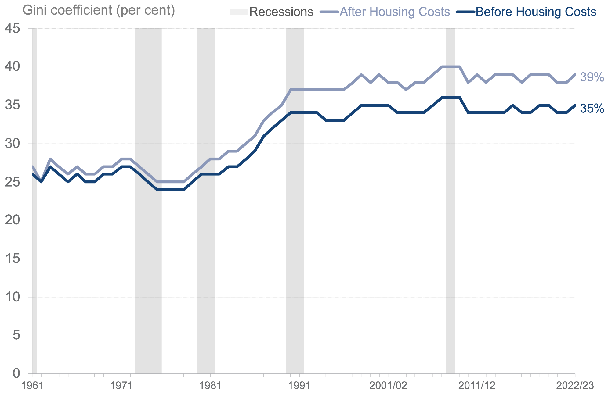 Incomes for those with children fell the most. Income inequality (measured by the Gini coefficient) after housing costs between the wealthiest fifth of the population and the poorest fifth has increased from 4.7 percent in 2003 to 5 percent in 2023. For a couple with two children under 14 in the lowest 10th percentile of wealth distribution before housing costs, the average disposable income in the year ending 2023 was £22,500. This compares to £16,100 for a couple with no children and £10,800 for a single adult. But since families require a higher level of household income to achieve similar living standards to childless and single households, to be in the top half of the income distribution in 2023, a single adult needed an annual household income over £21,700, compared to a couple with two children under 14, who required a combined annual household income over £45,400. This means that a single adult with an annual household income of over £42,900 would sit above the 90th percentile in wealth distribution in 2023, implying their income exceeded that of 90 percent of the UK population. In contrast, a couple with two children under 14 receiving the same level of combined annual household income would lie just below the middle of the income distribution and be considered to have slightly less than the average (median) household income.
